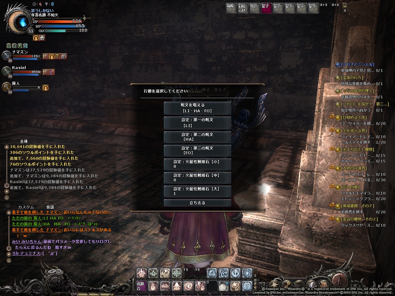 4 赤い魔方陣で、呪文【発動(HA)・広域の(MA)・火(LI)】触媒石小&中2個ずつで【マテリアル・コア(火)】GET